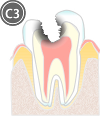 虫歯が象牙質の内側の歯髄に達したものです。この段階では、歯髄に細菌が進入し激しい痛みを伴うことがあります。
